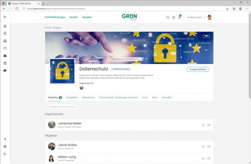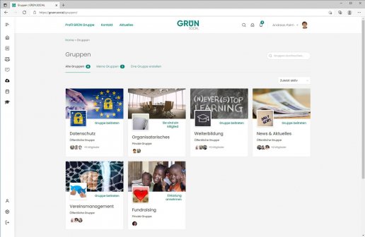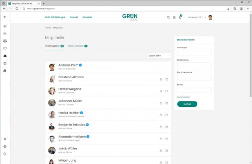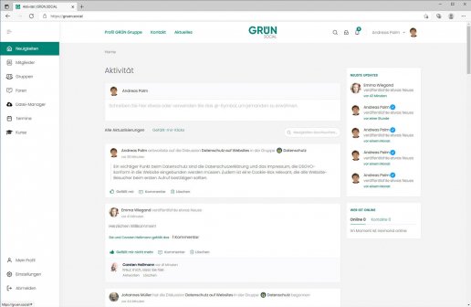 GRÜN.SOCIAL bietet als webbasierte Social-Software alle wichtigen Funktionen zum Aufbau einer effektiven Online-Zusammenarbeit in Organisationen und Unternehmen. In sich selbst organisierenden, virtuellen Gruppen können alle Benutzer in Echtzeit kommunizieren oder Informationen in Foren austauschen. Zu den weiteren Funktionen von GRÜN.SOCIAL gehören beispielsweise ein File Sharing, ein eLearning-System oder eine Zoom-Integration für Online-Meetings. GRÜN.SOCIAL ist flexibel einsetzbar und kann dadurch an individuelle Bedürfnisse angepasst werden. Alle Funktionen in GRÜN.SOCIAL sind individuell anpassbar und Sie entscheiden selbst, welche Module und Funktionen Sie nutzen wollen. Basis von GRÜN.SOCIAL2 ist das weltweit führende Content-Management-System WordPress, eine Betreuung erfolgt durch giftGRÜN, die Digitalagentur der GRÜN Software Group. Gerne passen wir GRÜN.SOCIAL an ihr eigenes Corporate Design an.