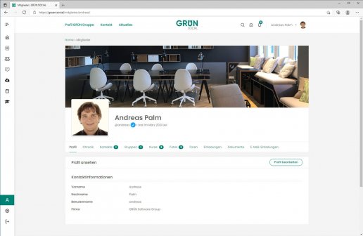 Jeder Nutzer in GRÜN.SOCIAL verfügt über ein eigenes Nutzerprofil. Alle Felder im Nutzerprofil, wie beispielsweise Profilbild, Titelbild, Qualifikationen oder Kontaktinformationen können individuell angepasst werden. Zusätzlich kann jeder Nutzer über sein Profil Fotoalben erstellen, Dokumente hochladen und verfügt über seine eigene Chronik und seinen eigenen Blog. Benutzer können sich untereinander individuell vernetzen und so eine Community aufbauen.